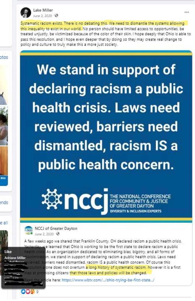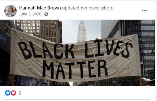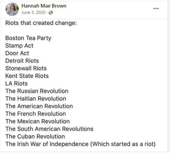 Just five days after her above posts, it was reported the riots had already left19 people dead (see here), and as a reminder, the riots went on to leave dozens dead, thousands injured, and approximately $2 billion in property damage, with stores looted and destroyed along with the livelihoods and finances of many of their owners, a historical 19th-century church in Washington D.C. and a police precinct in Minneapolis severely burned, a city block in Seattle overrun by violent extremists, and a federal courthouse in Portland besieged by Antifa and other rioters who attempted to set it on fire while federal employees were barricaded inside. BLM not only failed to condemn the riots, but the Chicago BLM leader defended the looting as “reparations” (see here), and within about three weeks of this NCCJ staffer’s posting, the New York Chapter BLM leader declined to condemn the rioting and stated, “[i]f this country doesn’t give us what we want, then we will burn down this system and replace it … I could be speaking figuratively, I could be speaking literally. It’s a matter of interpretation.” (see here). This NCCJ staffer’s Facebook posts remain on display (as of October 21, 2022), and this is the individual who is given direct access to Oakwood students to influence their views on diversity, inclusion, and quite possibly, political and social advocacy.