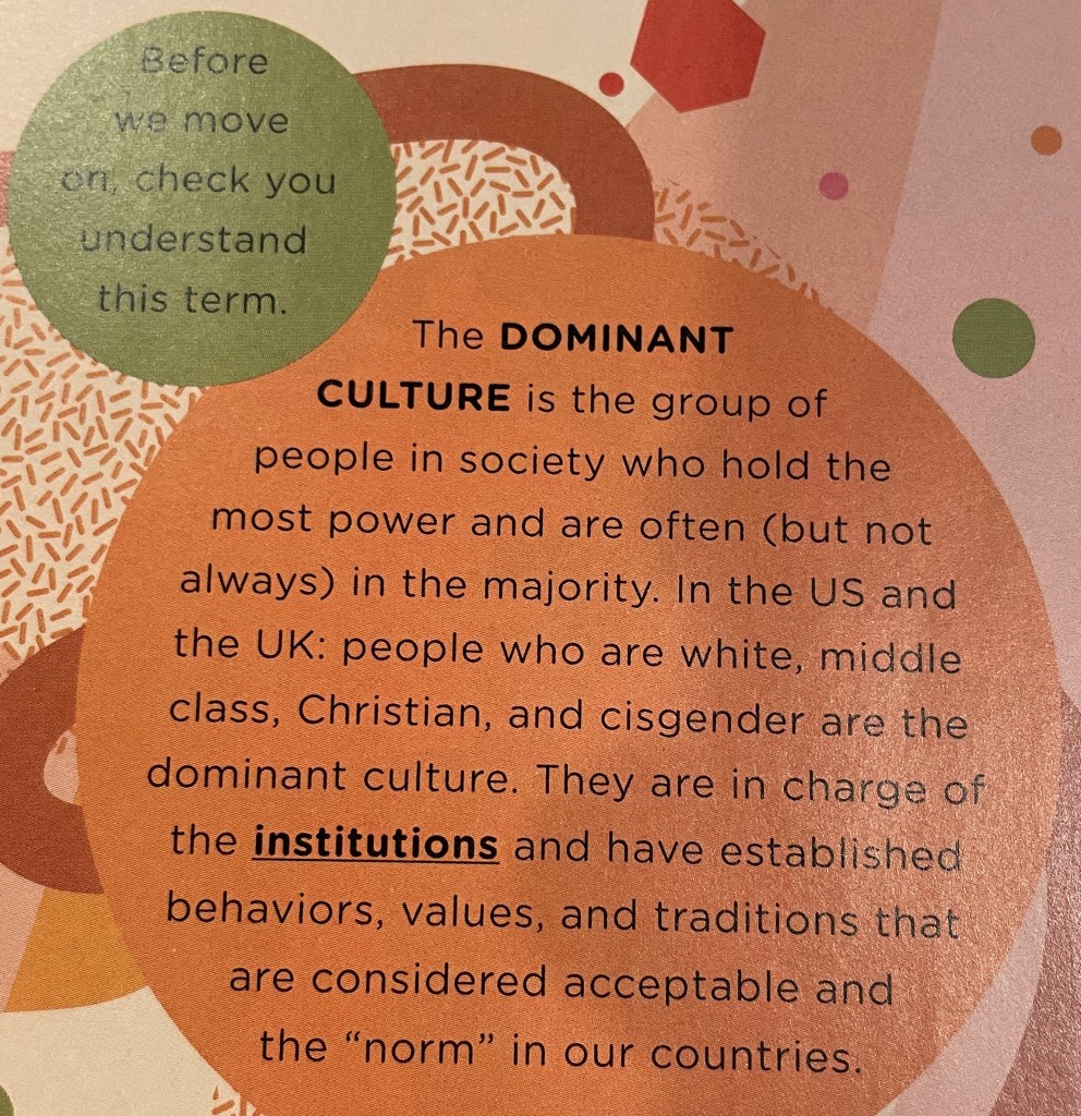 Chapter 1, “Who Am I,” introduces the idea of identity by identifying groups seen as the “dominant culture,” such as white, “cisgender,” “educated,” and “neurotypical” people. It is noted that these privileged individuals enjoy the benefits of the culture, as opposed to “subordinate culture,” such as blacks, queer, transgender, nonbinary, and neurodiverse individuals, among several specified in the text. The dichotomy of a normal/dominant culture versus the subordinate culture is a key tenet of CRT, derived from Marxist theories about the bourgeoisie and proletariat classes. As such, the book notes that “the dominant culture is the group of people in society who hold the most power.” As noted, this focus on power dynamics is also a key belief of CRT and Marxism.