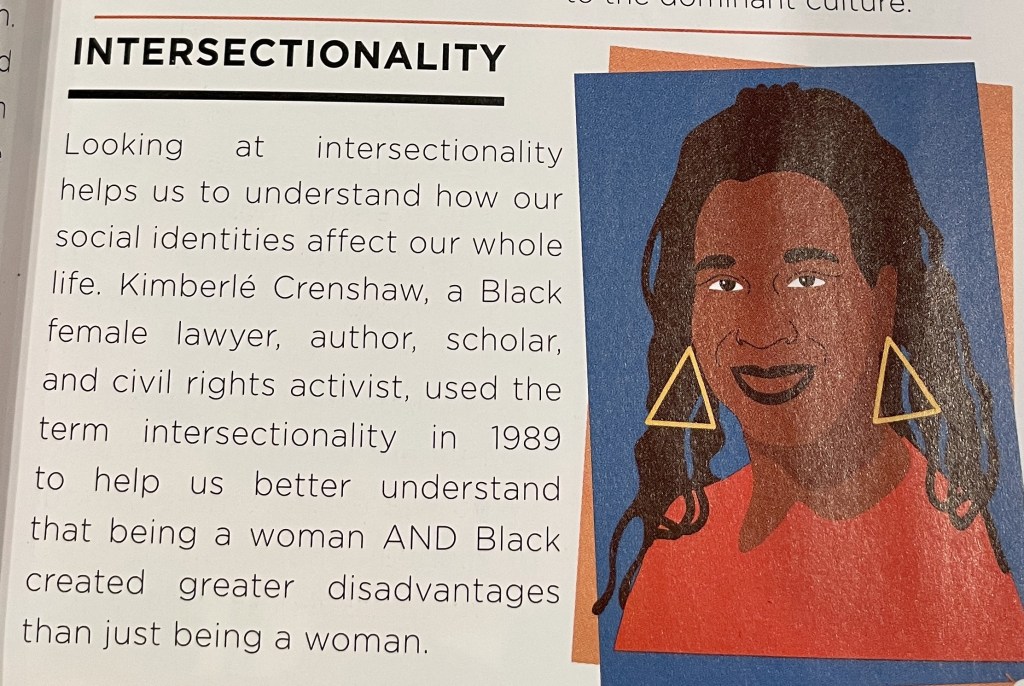 Chapter 2 brings additional discussion of social identities and introduces a discussion of privilege and intersectionality. It highlights Kimberle Crenshaw, a CRT proponent who first developed and promoted intersectionality as a concept that highlights layers of oppression based upon the social groups to which you belong. The idea is that if you belong to multiple “marginalized” groups, you will experience a unique and more severe degree of oppression. A concern that many parents have is that these ideas remove personal accountability as an individual can attribute their place in life to the hierarchy of oppression and society in general. This undermines the idea of the American Dream, where hard work can allow any citizen of America to do well for themselves.