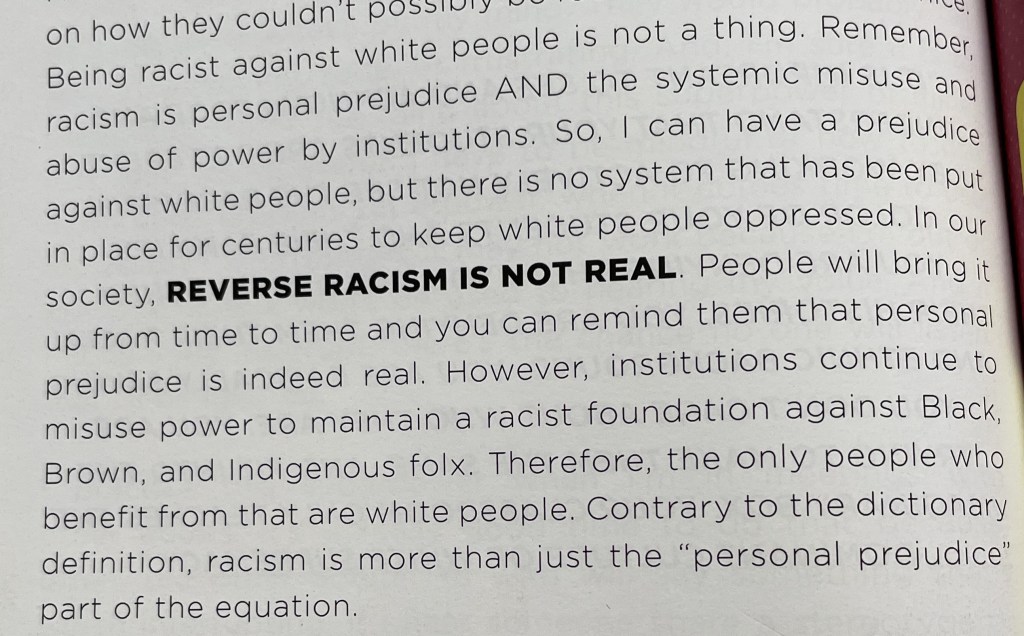 The next few chapters explore topics such as institutional power, systemic racism, and similar topics. All of these are key elements of CRT. Readers are encouraged to “notice who has power,” and to identify the “race of each of these folx,” and to see if they reflect the student or the “dominant culture.” Historical and modern topics from education to medical care are all discussed in a framework of race, highlighting perceived grievances for the reader.