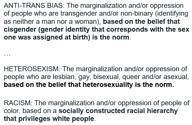 A review of NCCJ’s website similarly shows the organization actively promotes and teaches concepts of Critical Race Theory and Critical Theory generally, including in its online publications and in seminars it offers to the public, some of which are presented under the oft-used rubric of supporting “diversity, equity and inclusion”, “anti-racism” and “anti-bullying”. These include promoting blanket judgments of groups of people based on their racial and other demographics as “privileged” oppressors versus “oppressed” victims, teachings that any system or standard that yields or permits unequal outcomes is therefore systemically unjust, as well as controversial activist positions on sexuality and gender ideology.