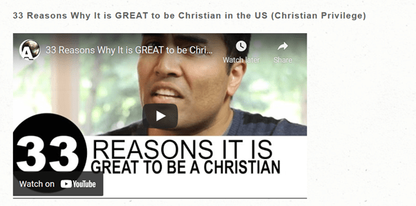 Among the “privileged” groups cataloged in NCCJ’s privilege publication are Christians. This is presented in a video (https://youtu.be/IMWNYmuhTvg) showing a man angrily lecturing the “Christian Right” and complaining of the widespread acceptance and display of Christian customs and beliefs, such as holidays and holiday greetings, various affirmations of shared Christian beliefs or values, songs promoting Christian beliefs (presumably Christmas carols and hymns, etc.), elected officials acting based on Christian moral beliefs, and even having private Christian schools. It exudes a clear intolerance of and opposition to the prevalence of Christianity and its influence on our society and culture. How does this reconcile with one of NCCJ’s stated purposes of “eliminating…bigotry”, as presented to the Board of Education?