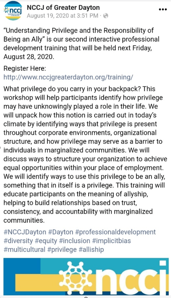 NCCJ’s Online Seminars and Workshops on “Privilege” and “The Role of the White Accomplice” (vs. an “Ally”)