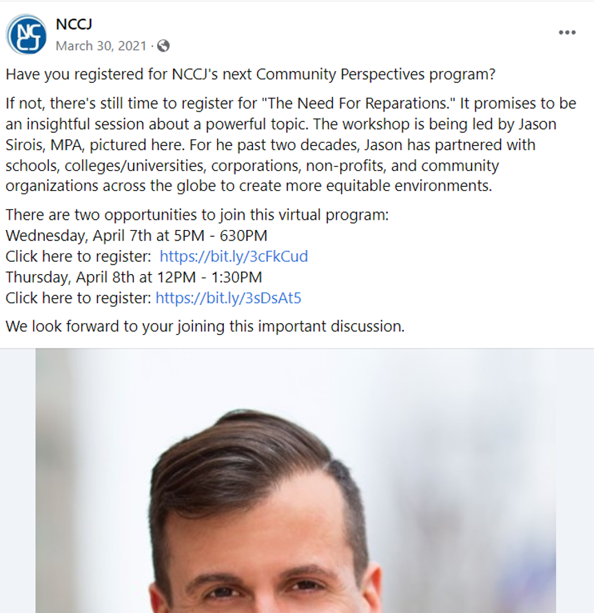 NCCJ hosts a series of online seminars, workshops, and “training” sessions (see here: https://www.nccj.org/mission) whose titles and descriptions show they also promote these CRT-driven ideologies of white privilege, systemic racism, and doing the “self-work” to “dismantle” “systems of oppression” seen with GSA Network’s Toolkit for student clubs. A two-day “Anti-Racism” session “is a live, online training program that explores bias, discrimination, oppression, and privilege in the United States”, while another program is titled “The Role of the White Accomplice” where one learns “the difference between an accomplice and an ally”. Note this session will be aired FREE from 12-1pm on Tuesday, November 15th, 2022. To watch it yourself, registerHERE.