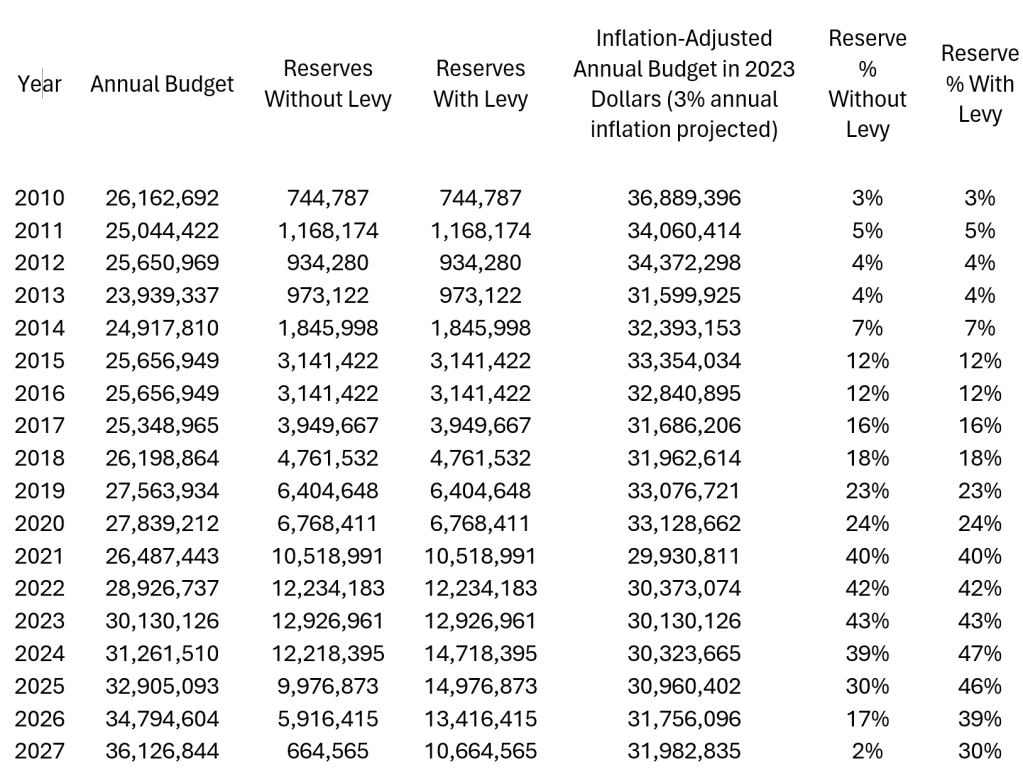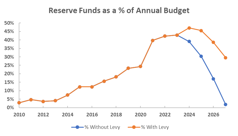Rejecting this levy would cap reserves now at 43%. With smaller tax revenues and reserve investments, reserves would fall faster.