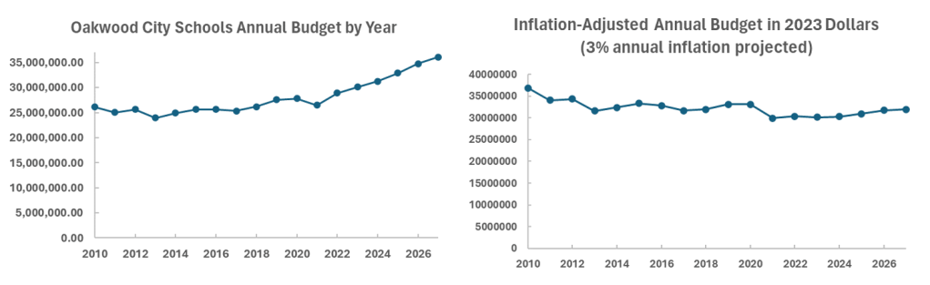 Figure 3: Oakwood City Schools’ Budget in Real Dollars (left) and 2023 Inflation Adjusted Dollars (Right)