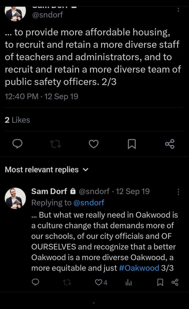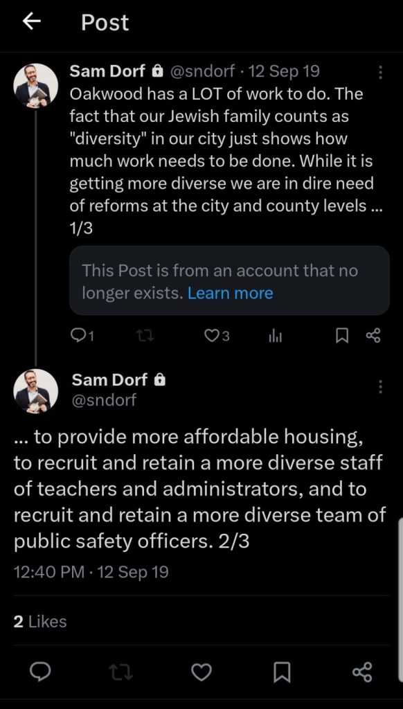 In the past several years, Oakwood City Council candidate Sam Dorf has repeatedly expressed great interest in expanding low income and multi-unit (aka “affordable”) housing in Oakwood, in conversation with residents and on social media. For example: