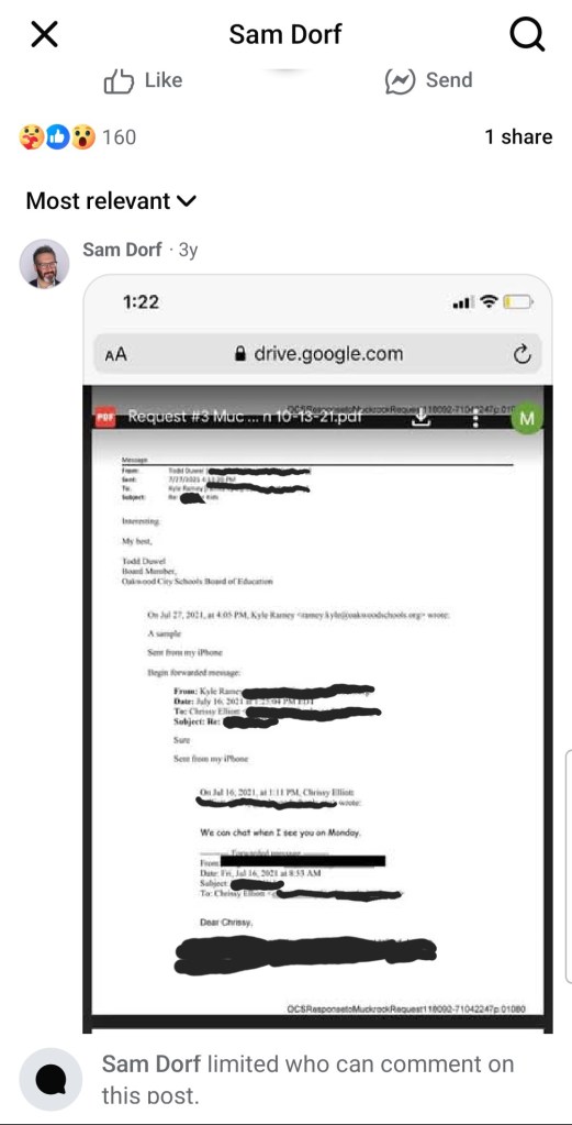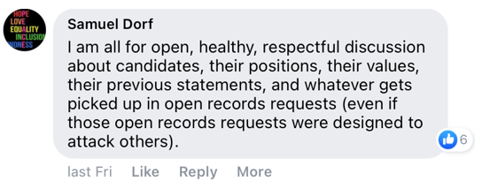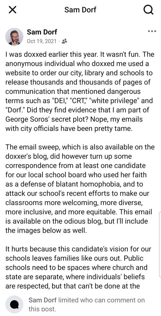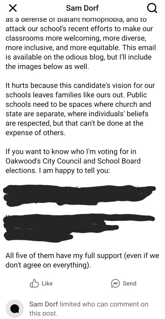 In the 2021 Board of Education election, a conservative candidate was vilified by progressive residents on social media and elsewhere, for statements she made in a private email to an Oakwood school official after the school district disclosed the email in response to a public records request. She expressed her religious reasons for asking the school to opt her children out of controversial classroom instruction on sexuality and gender identity. Her statements were entirely within mainstream Christianity, and her expressed view that public schools should be neutral on those topics is the most mainstream position on that issue. Her email was also personal, private, and sent before she was a candidate, in her role as a mother concerning her children. Nevertheless, residents posted the private email on social media during the election and used it as fodder to attack the candidate for her religious and other views on those topics, including Sam Dorf himself, who called her beliefs “homophobic” (candidate’s email is left out for privacy reasons):