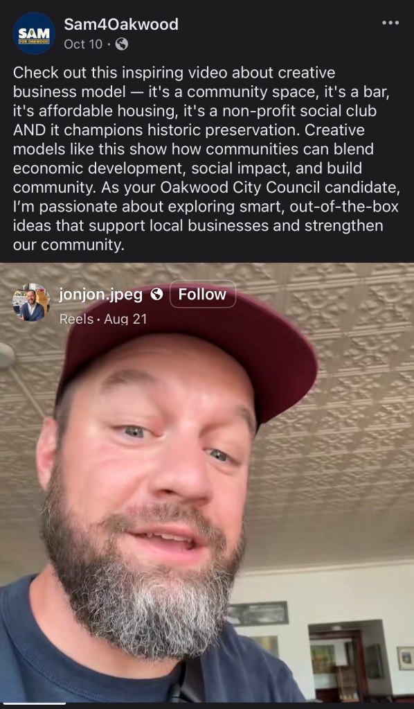Sam’s polished ads and campaign website tell a story that doesn’t square with his record. He says he’ll “work collaboratively and transparently,” and support “open communication,” yet his past approach has divided neighbors and undermined trust in city leadership. He now praises the very Public Safety Department he once accused of bias. He claims to champion unity, but his history shows a pattern of divisive politicization. Oakwood deserves steady, reasonable leaders who protect our community, support our officers, and rely on facts – not polarizing activists who rely on flawed assumptions and put their politics ahead of public safety.